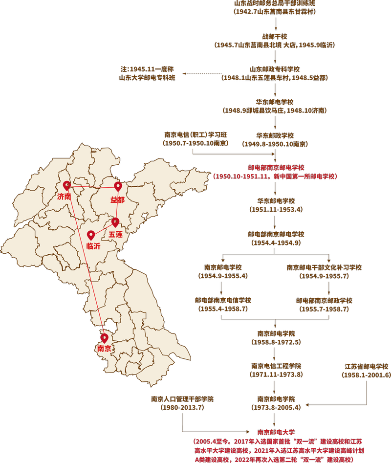 南京邮电大学成立于1958年,连同前身,校史历经80余年。其前身最早是1942年创办于山东滨海抗日民主根据地的“战时邮务总局干部训练班”,1945年7月训练班扩建为“战邮”学校,嗣后,一度称为山东大学邮电专科部及山东邮政专科学校。校址先后辗转在鲁南、临沂、五莲等地。在1942年至 1947年间,训练班主任及嗣后学校校长均由当时战邮总局局长赵志刚兼任。(赵志刚在建国后曾长期担任邮电部副部长主管邮电教育工作。)1948年,学校在益都(青州)定名华东邮电学校,隶属于当时华东邮电管理总局。1949年8月,学校从山东济南迁到南京市。在1942年至1949年建国之前的八年间,学校为革命战争培养了一批急需的邮电通信中坚人才。