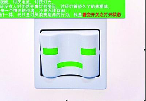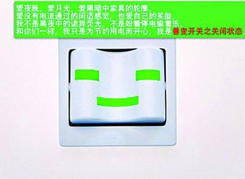 看上去一个简单的设计,却又别出心裁地传递着环保的概念。参与设计的李亚东同学告诉记者,这个开关视觉造型简洁明了,符合节能减排特色,有现代设计感;“哭脸”和“笑脸”分别与“开”和“关”相关联,简单对比表达出节能减排的概念,号召大众随手关灯,帮助使用者养成随手关灯的习惯,使大众做到节能减排。