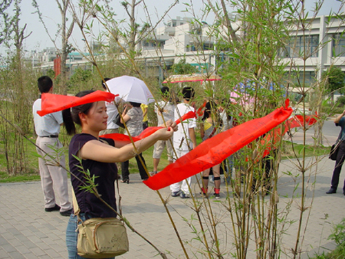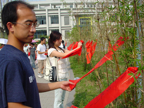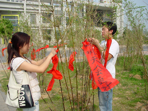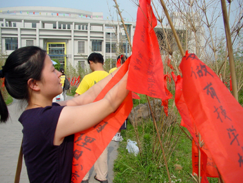 中国江苏网消息:6月17日下午,南京邮电大学一群即将毕业的大四学生来到仙林校区,将一条条红丝带系在学径两边的竹枝上,“请记住阳光总在风雨后,一起加油吧!”、“一个今天胜过两个明天”、“寄语学弟学妹:努力与快乐同在!”、“当自己都不知自己在干什么的时候,就是该好好思考自己的时候”、“重要的不是所站的位置,而是所朝的方向”、“少玩游戏,多上自习”、“I believe you can fly”……,这些红丝带上的话语,有的是自身的经验传授,有的是发自内心的祝福,有的是诚恳的劝勉,飘扬的丝带引来不少在仙林的南邮学子驻足观看,以红丝带表达学长的心意这种方式,让平时较少有机会接触学长的一二三年级学生以一种别样的心情感受到了温情的传递。