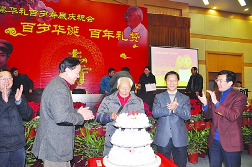 昨天,南京邮电大学为首任老院长、老红军,百岁老人秦华礼举办百岁寿辰庆祝会。令来宾感叹的是,虽然一百岁高龄,秦老脸上却没有太多皱纹,而且腰背挺直、精神矍铄、步履坚定,满头银发纹丝不乱。熟悉他的人都说,秦老热爱生活,90多岁还带领南邮的老年门球队满中国“飞”,参加比赛。每天读《扬子晚报》也是他多年的习惯之一。