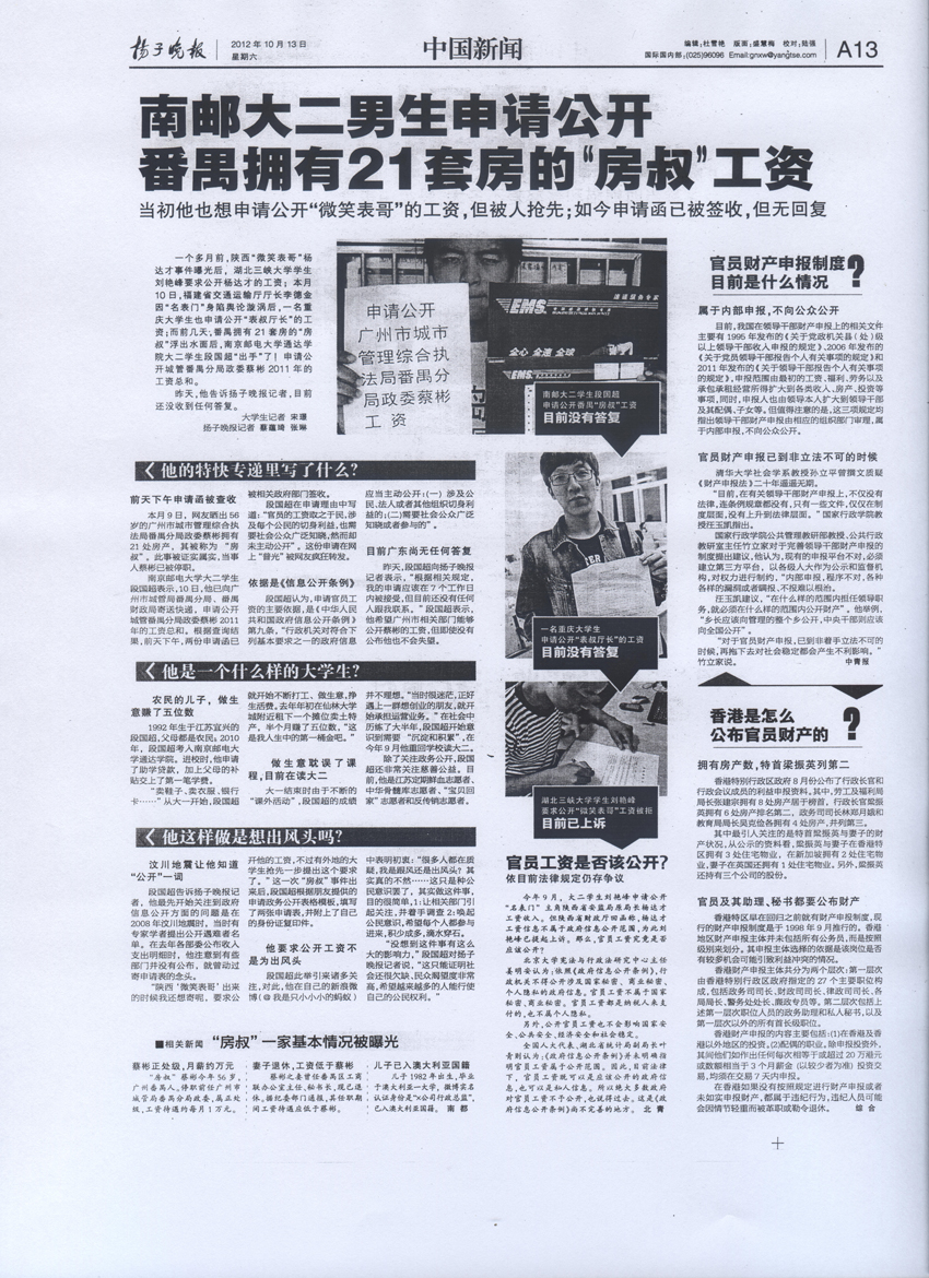 【扬子晚报】南京大二男生申请公开番禺拥有21套房的房叔工资