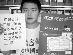 “我当时也想申请公开‘表哥’杨达才工资,可惜晚了一步,被三峡大学的刘艳峰抢先申请了。”南京邮电大学大二男生段国超对记者说,在看到广州城管局番禺分局政委蔡彬及其家人拥有21处房产的消息后,他10日以寄送快递的方式,向广东市城市管理综合执法局番禺分局组织人事科申请公开蔡彬2011年的工资。尽管申请公开“表哥”工资的刘艳峰吃过闭门羹,可段国超依然充满希望,“我只是在行使公民的知情权,希望45块钱的邮费不会浪费。”他说。