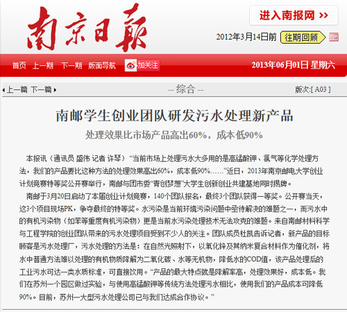 【南京日报】南邮学生创业团队研发污水处理新产品