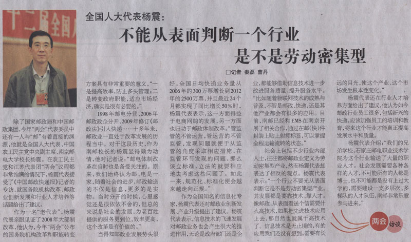 【邮政快递报】不能从表面判断一个行业是不是劳动密集型(采访杨震校长)