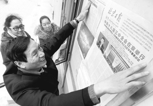 北京市西城区金融街街道东太平社区的工作人员把报纸挂到报栏上,方便社区居民学习。CFP