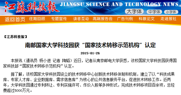 【江苏科技报】南邮国家大学科技园获“国家技术转移示范机构”认定