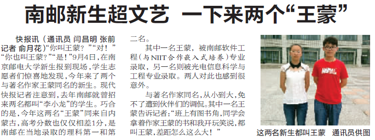 【现代快报】南邮新生超文艺 一下来了两个“王蒙”