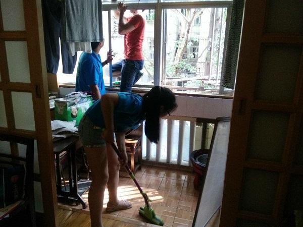 志愿者在擦玻璃、打扫房间 中国青年网通讯员秦爽提供