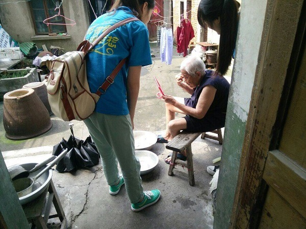 在东沟镇当地人的指引下,志愿者来到了李爷爷和刘奶奶家。两位老人年龄都非常大了,见到志愿者来,两位老人充满了疑惑。志愿者赶快走上前说是志愿服务的。但他们的热情引起了防范,“你们要不要钱,我们没钱!”李奶奶疑惑地说。胡婷婷赶快上前说明来意,两位老人这才同意稍稍释怀。