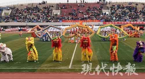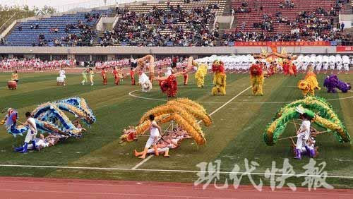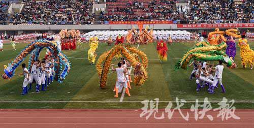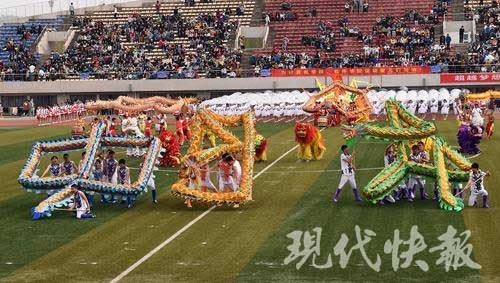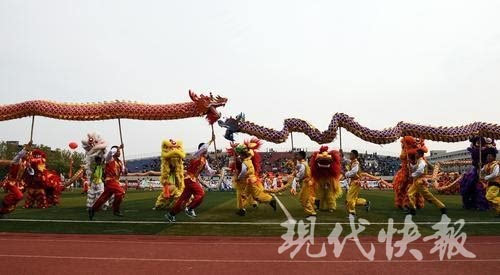 平盘波浪、孔雀开屏、飞龙在天……10月30日上午,南京邮电大学在仙林校区体育场举办第46届运动会。一支由140人组成的龙狮队真神气,在他们精彩的表演中拉开了开幕式的序幕。他们个个精神抖擞,能摆出很多高难度动作。现代快报记者 俞月花/文 徐洋/摄