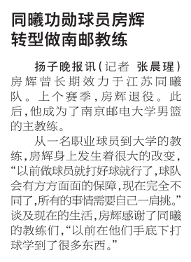 【扬子晚报】同曦功勋球员房辉转型做南邮教练