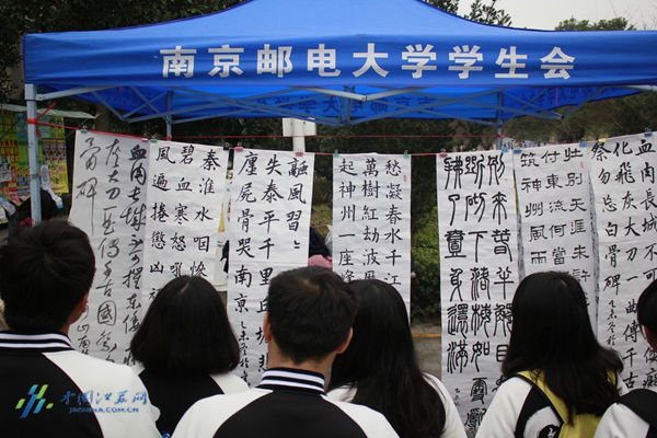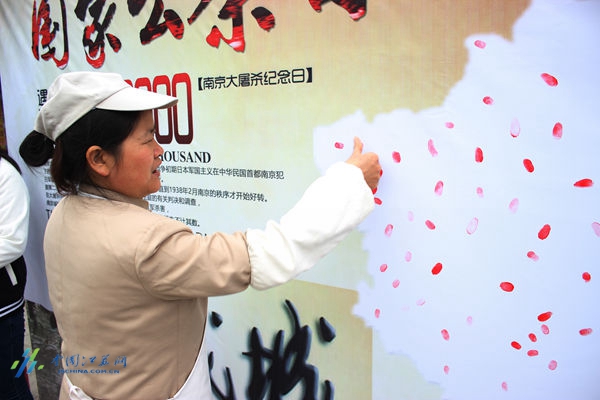 活动现场由“和平之花”——佩戴紫金草徽章行动、“墨哀英魂”——主题书法展、“众指成城”——指印寄思等别出心裁、内涵丰富、寓意深刻的系列活动组成。上午十时零一分,随着防空警报声在南京上空响起,在场同学佩带着象征和平的紫金草徽章集体默哀。随后,同学们依次参观了书法作品展,在中国地图上按下红色指印,并在“国行公祭,祀我国殇。永矢弗谖,祈愿和平”的标语上签名,表明了同学们齐心协力,携手共进,誓亲手捍卫祖国领土完整的决心。