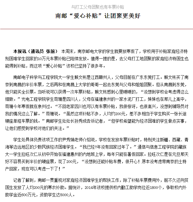 【江苏教育报】南邮“爱心补贴”让团聚更美好