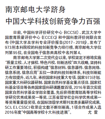 【新华日报】南京邮电大学跻身中国大学科技创新竞争力百强