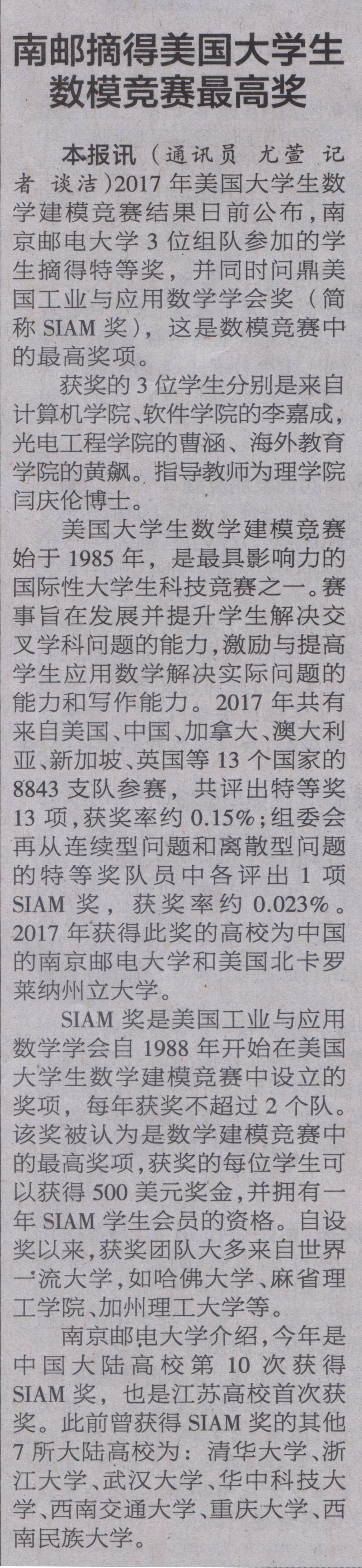 【南京日报】南邮摘得美国大学生数模竞赛最高奖