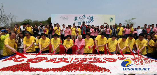 活动现场还制作了由校友捐赠的宽1.9米长4.2米厚75毫米的巨型生日蛋糕,寓意南邮从1942年诞生至今,已经走过75周年的光荣历程。蛋糕上鲜红的草莓摆出了“祝母校75岁生日快乐”的字样。秦老书记和全体校领导为参加当天活动的师生、校友切分校庆生日蛋糕。
