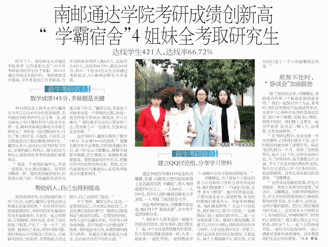 【扬州晚报】南邮通达学院考研成绩创新高 “学霸宿舍”4姐妹全考取研究生