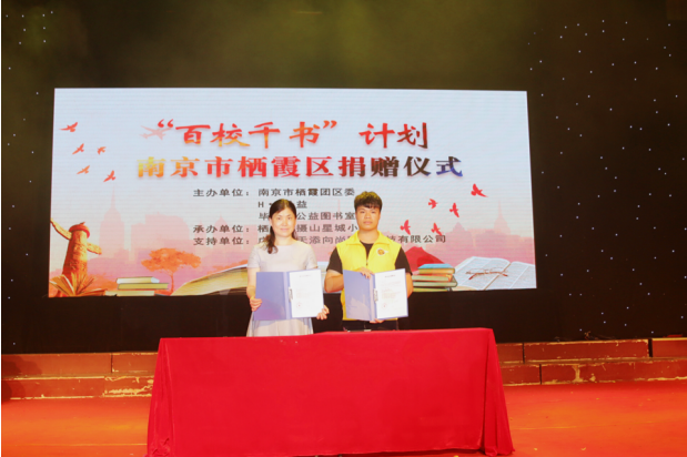 在现场热烈的掌声中,毕业后公益图书室联合创始人李达与南京市摄山星城小学欧校长签署图书接收协议。