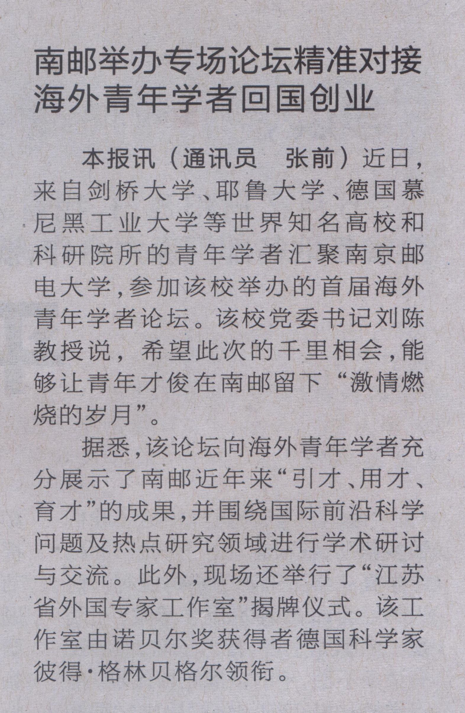 【江苏教育报】南邮举办专场论坛 精准对接 海外青年学者回国创业