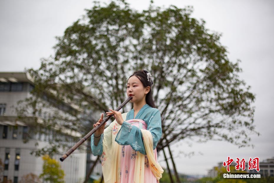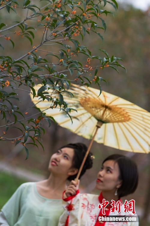 10月11日,南京邮电大学沅芷古琴社的学生身着汉服,在120年树龄的“丹桂王”前赏花吟诗。近日,南京邮电大学仙林校区丹桂园中千株丹桂陆续开放,其淡雅的香气沁人心脾,引得师生们徜徉期间。据介绍,园内这棵120年树龄的“丹桂王”名为“大叶朱砂桂”,来自“中国丹桂之乡”福建省南平市浦城县,经过精心维护,成为了南京高校中的又一景点新名片。中新社记者 泱波 摄