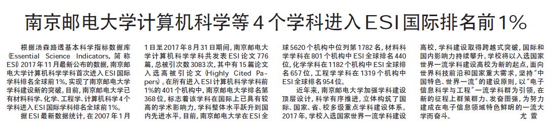 【新华日报】南京邮电大学计算机科学等4个学科进入ESI国际排名前1%