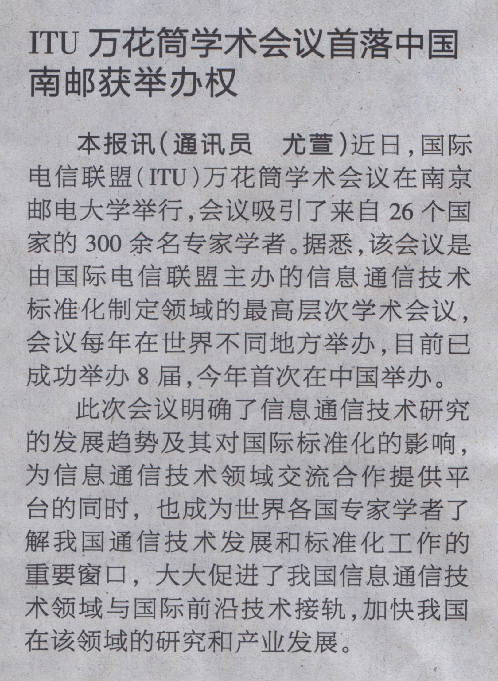 【江苏教育报】ITU万花筒学术会议首落中国 南邮获举办权