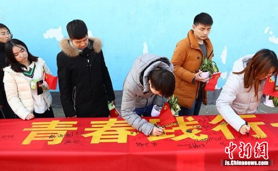 大学生们在“青春践行”的标语上签名。 泱波 摄