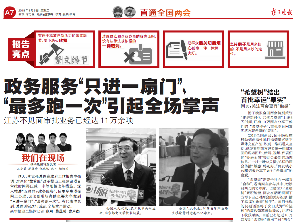 【扬子晚报】政务服务“只进一扇门”、“最多跑一次”引起全场掌声