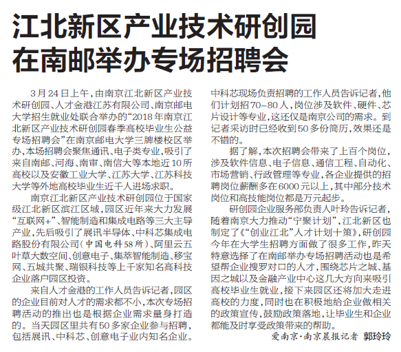 【南京晨报】江北新区产业技术研创园 在南邮举办专场招聘会