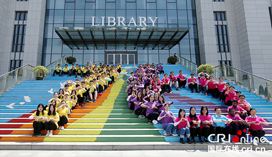 师生在图书馆门前的阶梯上摆出“76”的造型迎校庆 尤萱 摄
