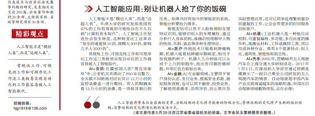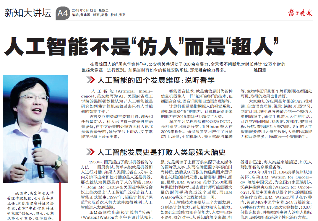 【扬子晚报】人工智能不是“仿人”而是“超人”
