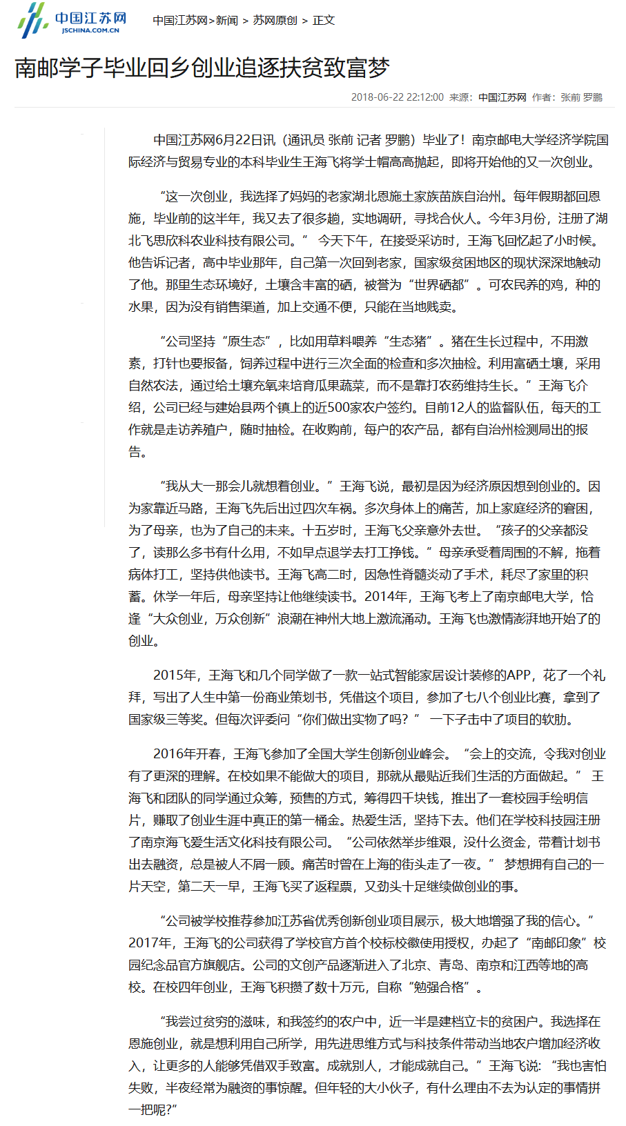 【中国江苏网】南邮学子毕业回乡创业追逐扶贫致富梦