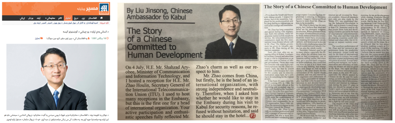 7月7日,中国驻阿富汗大使刘劲松在阿富汗主流报刊《阿富汗时报》(英文)、《马塞尔日报》(普什图文)刊发署名文章《讲一个中国人致力于人类进步的故事》,介绍我校杰出校友、国际电信联盟秘书长赵厚麟。中文原文如下: