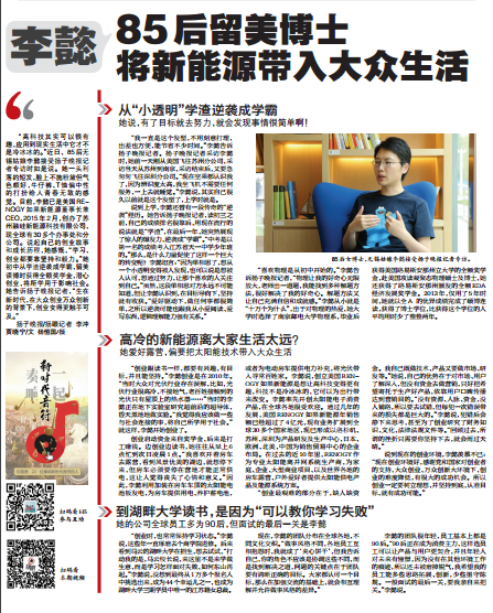 “高科技其实可以很有趣,应用到现实生活中它才不是冷冰冰的。”近日, 85后无锡姑娘李懿接受扬子晚报记者专访时如是说。她一头利落的短发,脸上不施粉黛但气色颇好,牛仔裤、T恤偏中性的打扮给人青春无敌的感觉。目前,李懿已是美国RENOGY如果新能源董事长兼CEO,2015年2月,创办了苏州融硅新能源科技有限公司,现全球有30多个办事处和分公司。说起自己的创业故事和成长历程,她感慨,“学习、创业都要靠坚持和毅力。”她初中从学渣逆袭成学霸,留美读博时获得全额奖学金,潜心创业,将所学用于影响社会。她告诉扬子晚报记者,“生在新时代,在大众创业万众创新的背景下,创业变得更触手可及。”