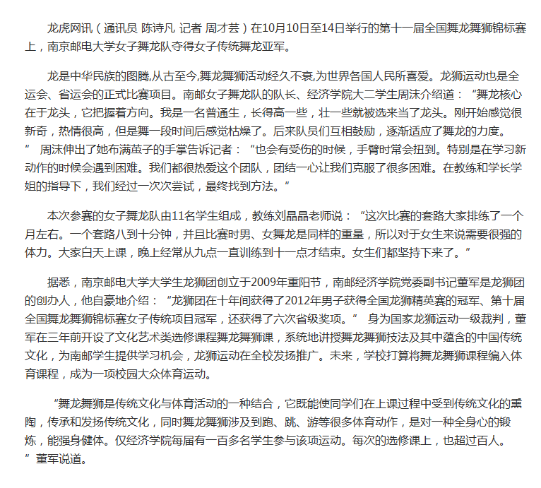 【龙虎网】南邮获第十一届全国舞龙舞狮锦标赛女子传统舞龙亚军
