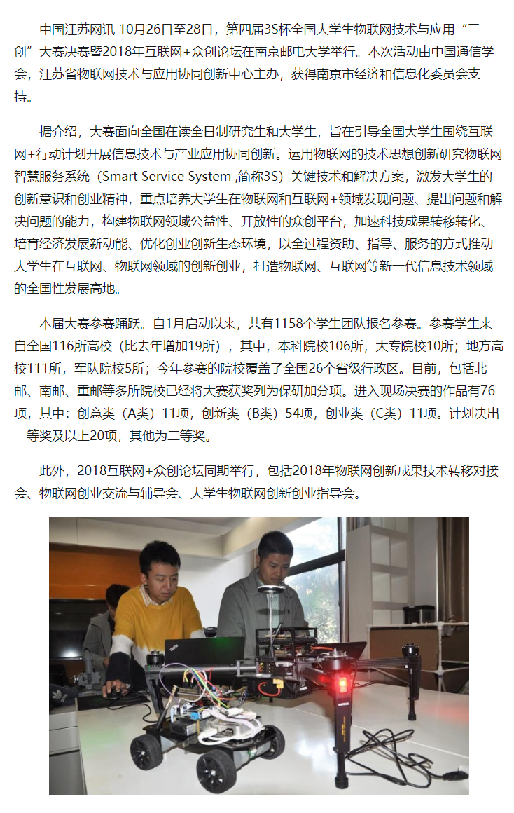 【中国江苏网】第四届3S杯全国大学生物联网技术与应用“三创”大赛在南邮举行