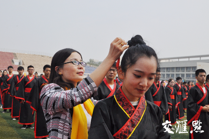 活动现场,经济学院的部分院领导、关工委代表、三十年以上教龄的教师代表、新生班主任等数十人为学生代表加冠、及笄。其他学生自行加冠及笄。全体新生举起右拳宣誓,诵读成人礼誓词。“第一次为学生加冠,我很激动,同时也感受到浓浓的尊师重教的氛围。”有着33年教龄的尹勤教授说:“身为教师,一定要坚持立德树人,继承孔子因材施教的思想,将教书与育人结合在一起。”