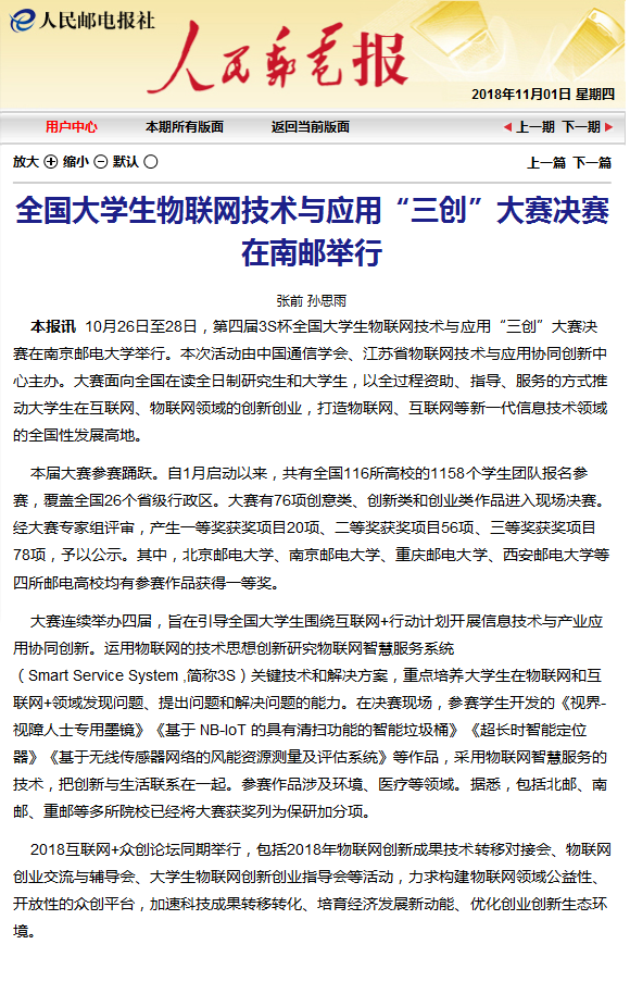 【人民邮电报】全国大学生物联网技术与应用“三创”大赛决赛在南邮举行