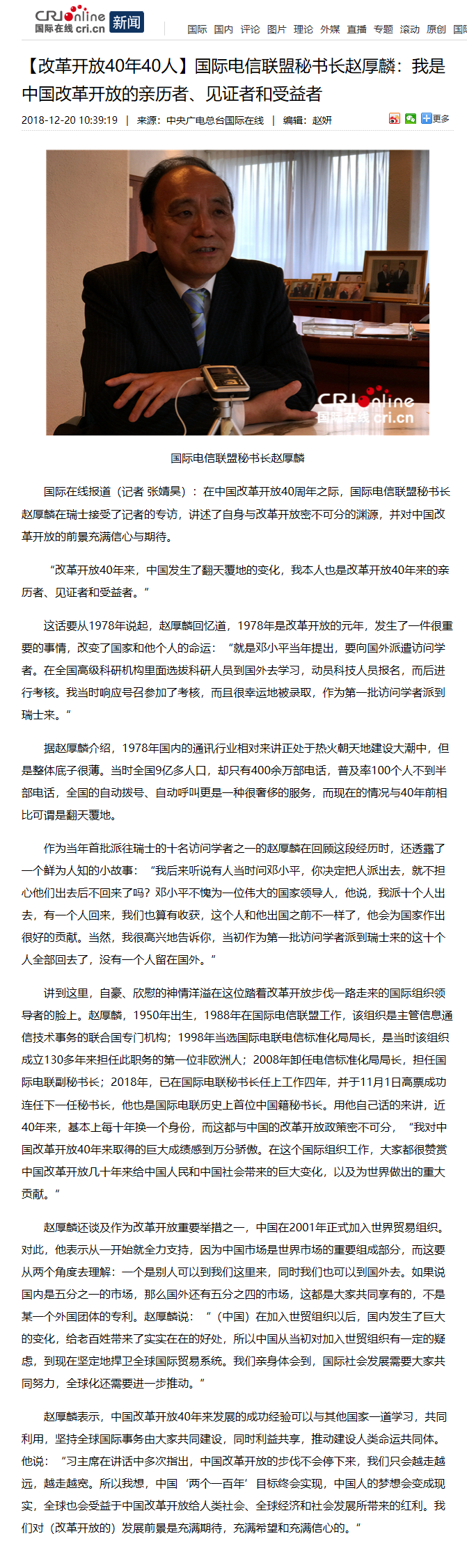 【中央广电总台国际在线】国际电信联盟秘书长赵厚麟:我是中国改革开放的亲历者、见证者和受益者