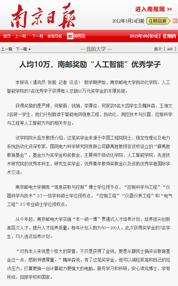 【南京日报】人均10万,南邮奖励“人工智能”优秀学子