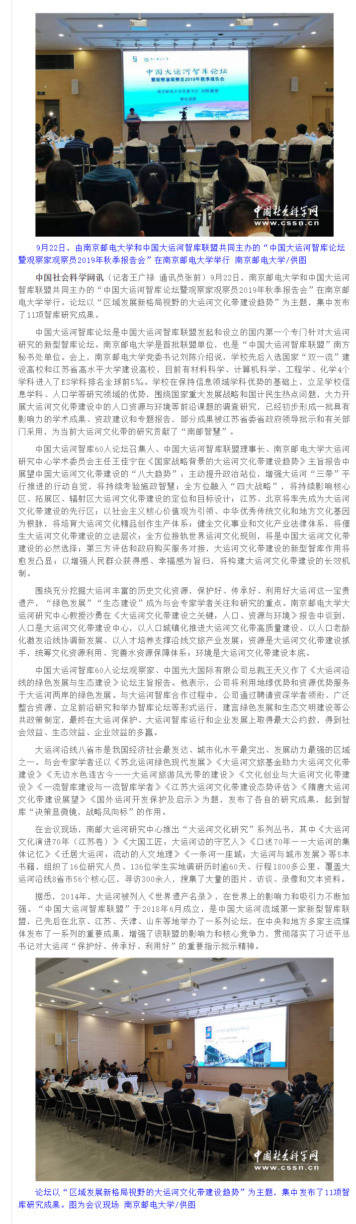 【中国社会科学网】中国大运河智库论坛暨观察家观察员2019年秋季报告会在南京邮电大学举行