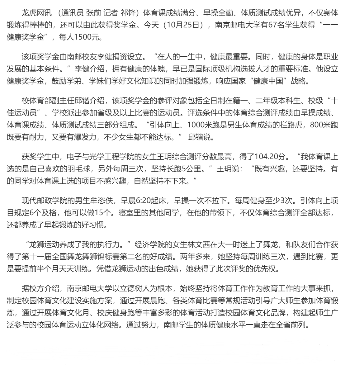 【龙虎网】南邮设立“健康奖学金” 学生锻炼好身体就有机会拿