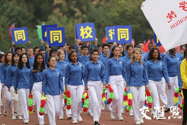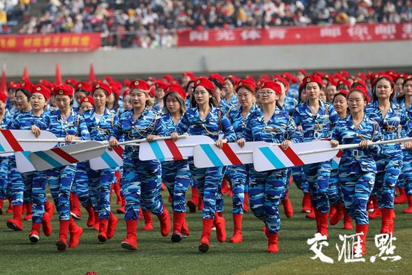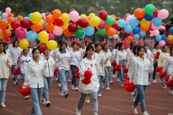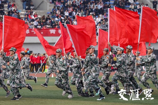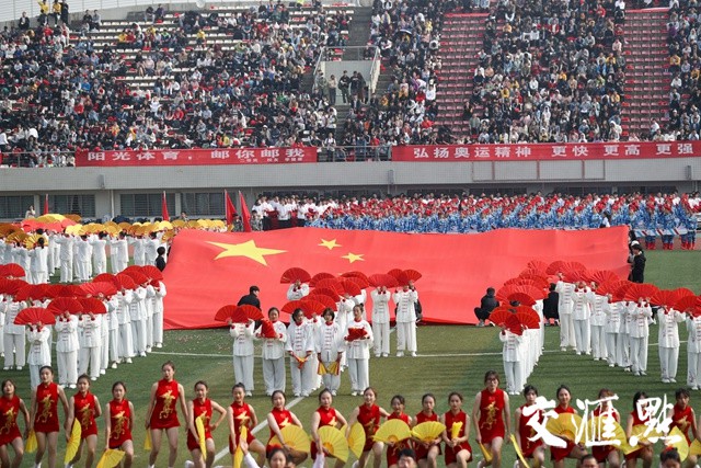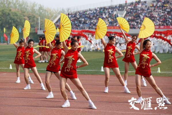 2019年10月25日,南京邮电大学举行第五十届田径运动会,学生们轮番展示龙狮表演《盛世华章——新时代》、健身舞《光芒》、啦啦操《青春赞歌》、团体操《红旗飘扬》、《我和我的祖国》等节目,现场涌动着浓浓的爱国情。交汇点记者陈俨摄