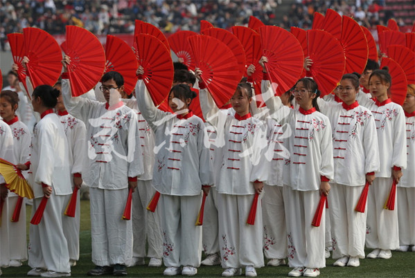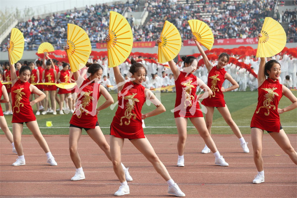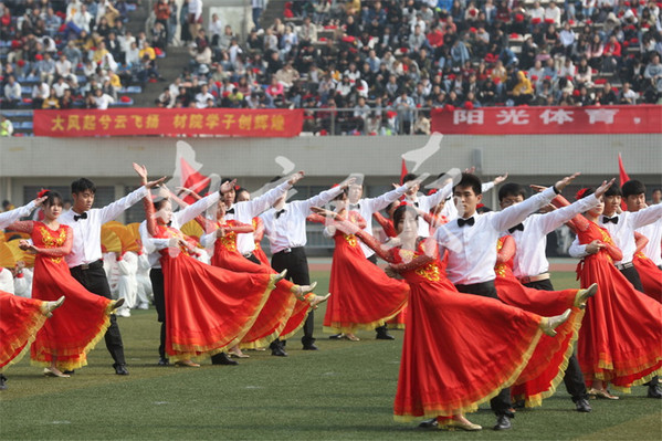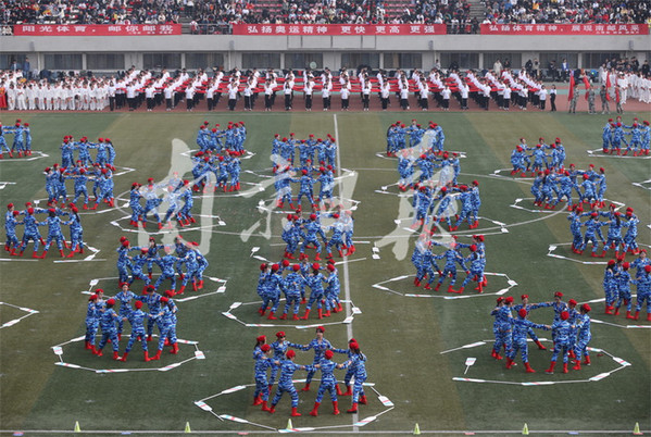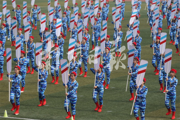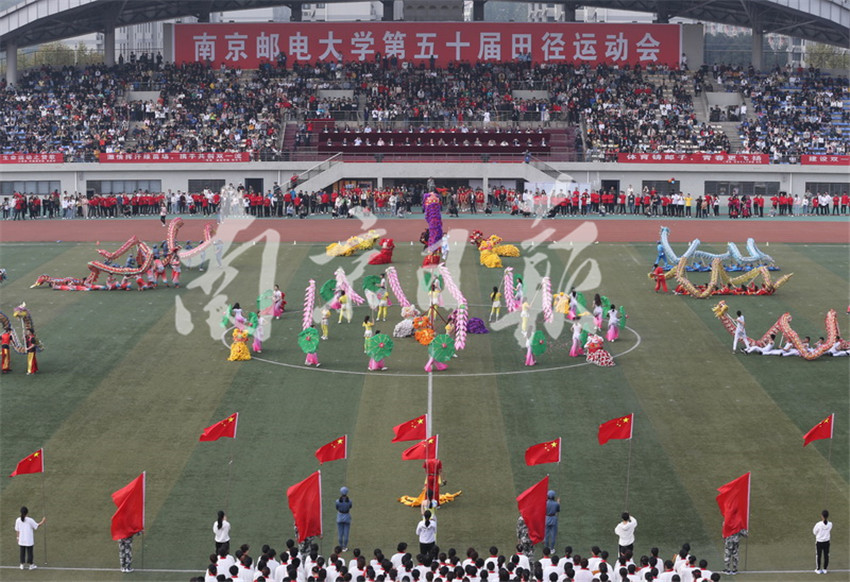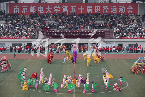 10月25日,南京邮电大学举行第五十届田径运动会,来自各个院系的大学生们整齐亮相,配以不同的服饰轮番展示舞龙舞狮、啦啦操、团体操等节目,展示大学生青春风采,现场涌动浓浓的爱国情。本报通讯员 张前 本报记者 徐琦 摄