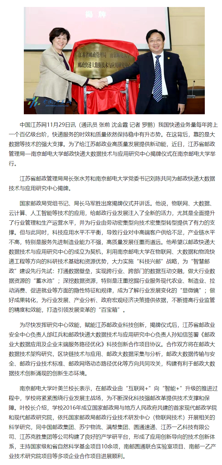 【中国江苏网】邮政快递大数据技术与应用研究中心在南邮揭牌