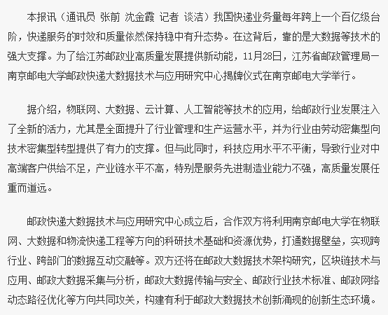 【南京日报】南邮成立邮政快递大数据研究中心