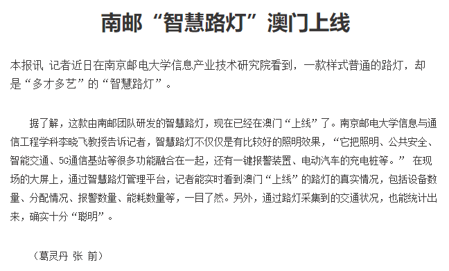 【新华日报】南邮“智慧路灯”澳门上线