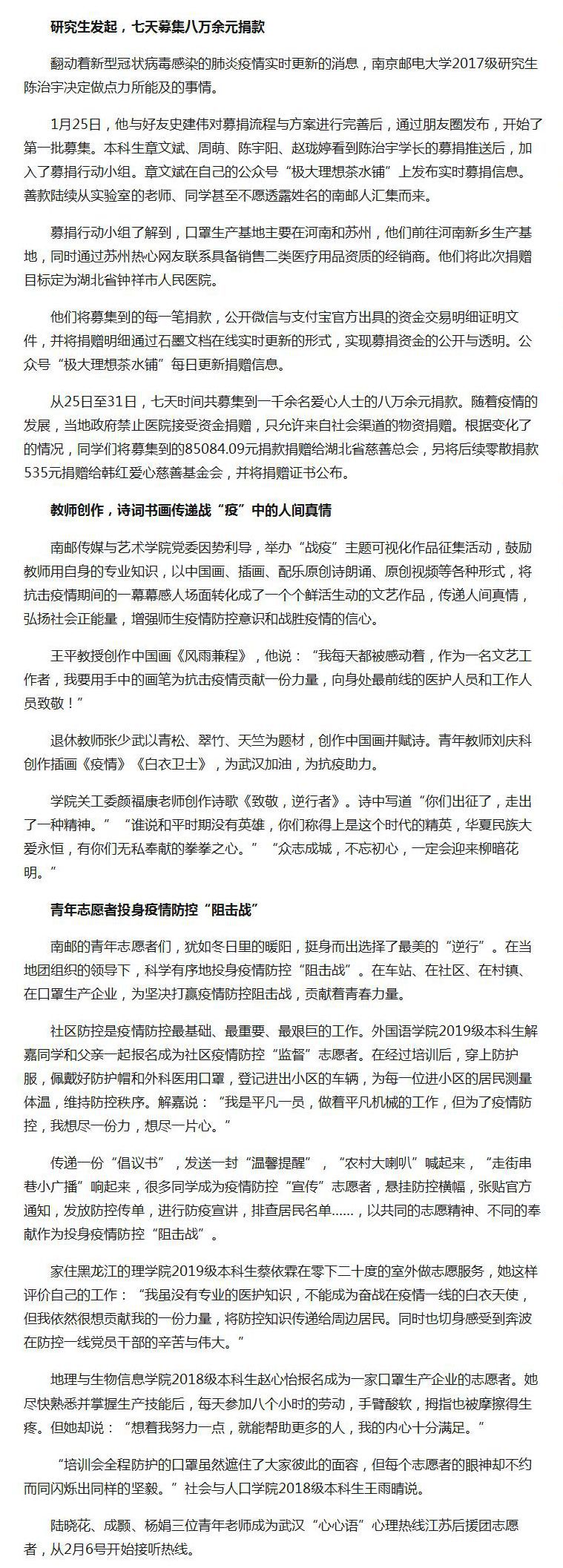 【中国江苏网】研究生募集八万元、教师创作诗词书画 南邮师生防“疫”战“疫”在行动