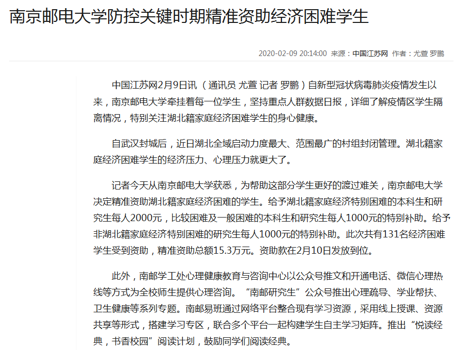 【中国江苏网】南京邮电大学防控关键时期精准资助经济困难学生