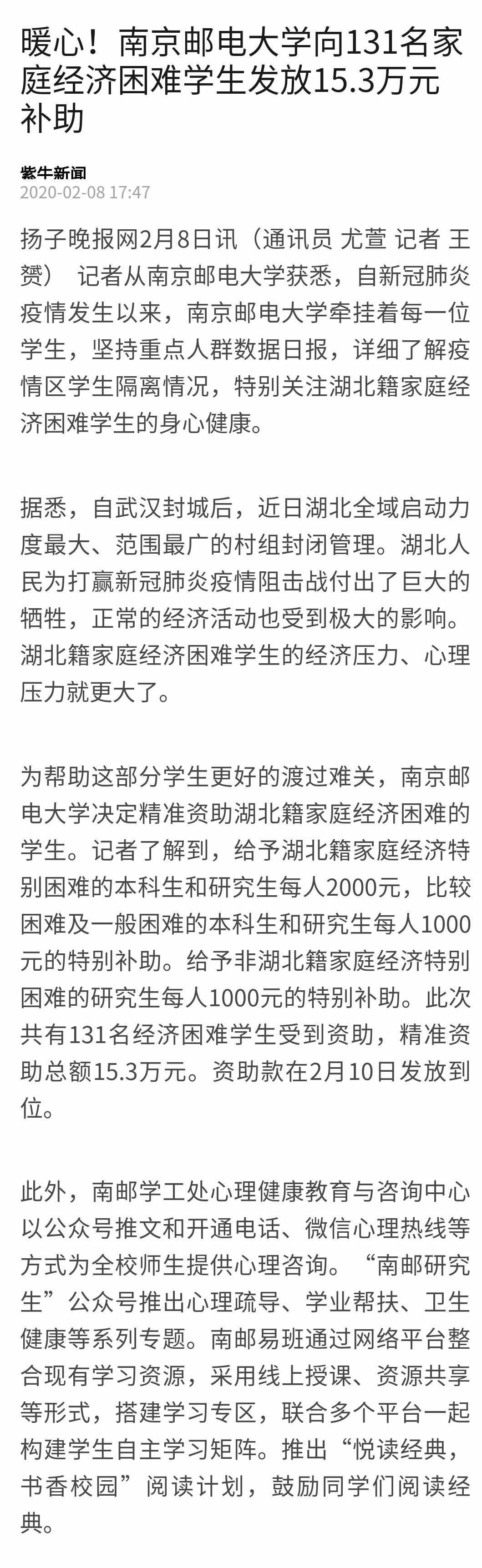 【扬子晚报网】暖心!南京邮电大学向131名家庭经济困难学生发放15.3万元补助